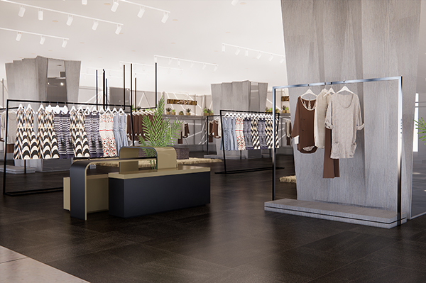 下面這套商場內的品牌服裝店裝修效果圖在風格選取上正好解決了品牌定位問題,最大程度上向顧客傳遞了品牌帶來的潮酷金屬氛圍,店內裝修環境表達上也傾向于侘寂風,屬于典型的潮牌店。